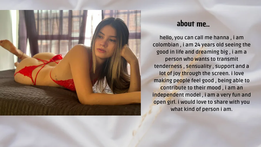 Hello, my name is hanna, I’m 25 years old, nice to meet you in my room! I love series and books, don’t be shy, ask me, I love talking about it, i would say that i am also a very passionate woman and i have a great sense of humor. I can give you the spark you need to feel perfect. My positive energy and my sexy body will drive you crazy. Don’t hesitate to askme anything on camera, to get to know me better.